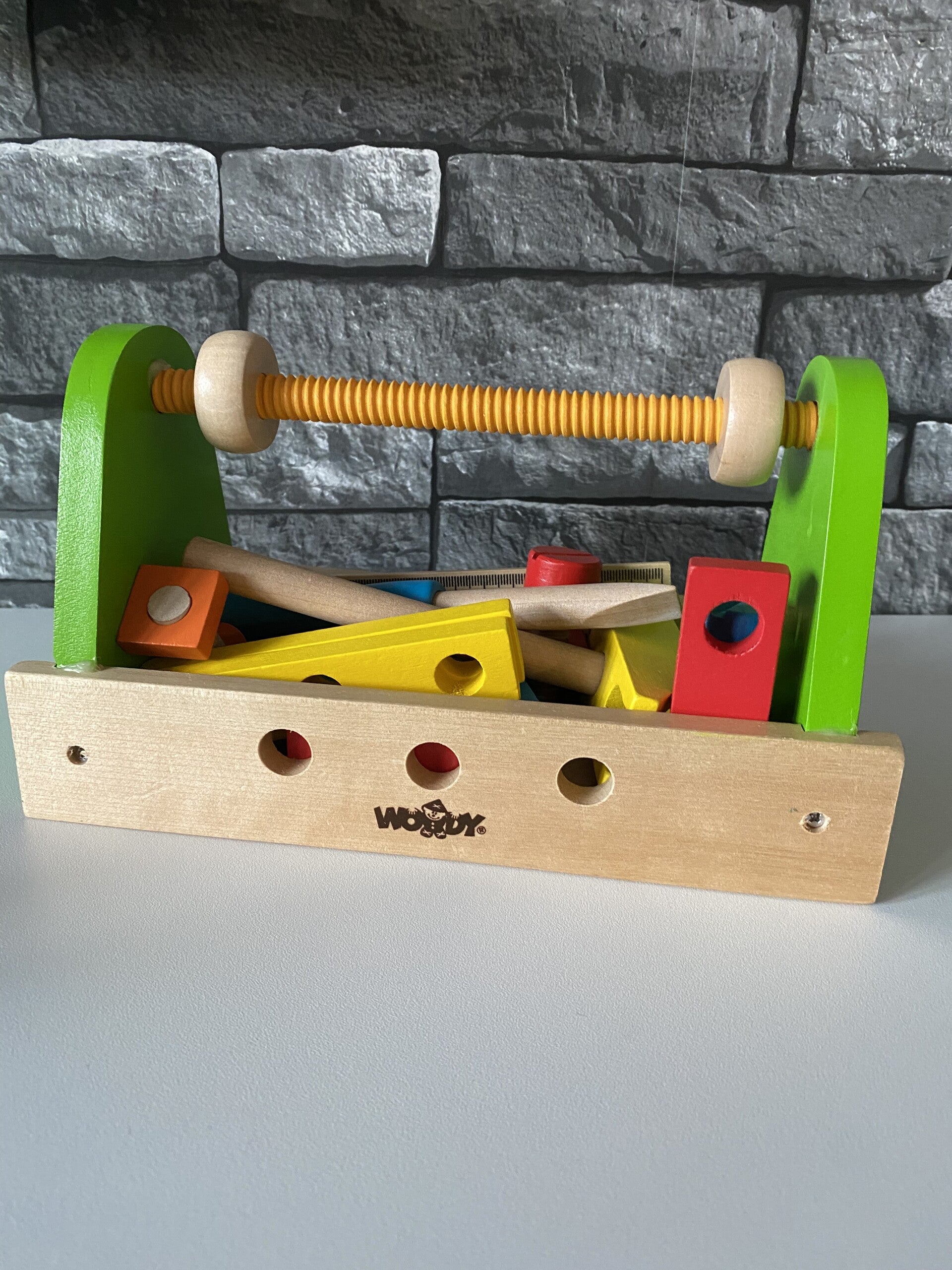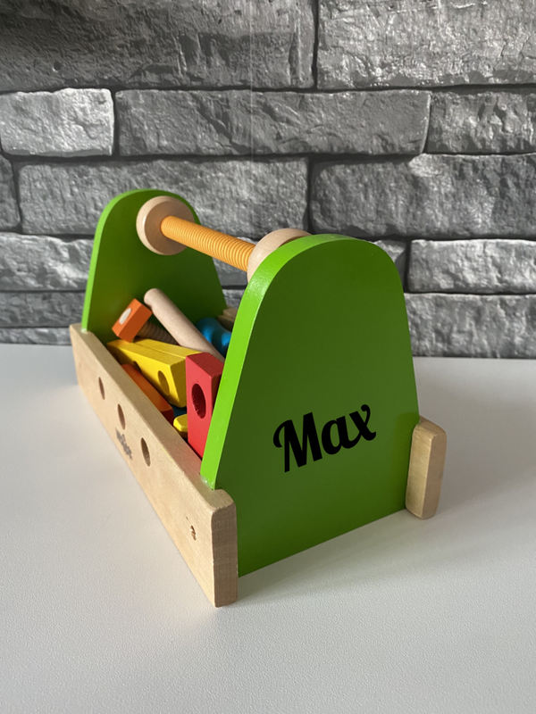 Deze super leuke houten gereedschapskist kan aan beide kanten voorzien worden van de naam van het kindje.